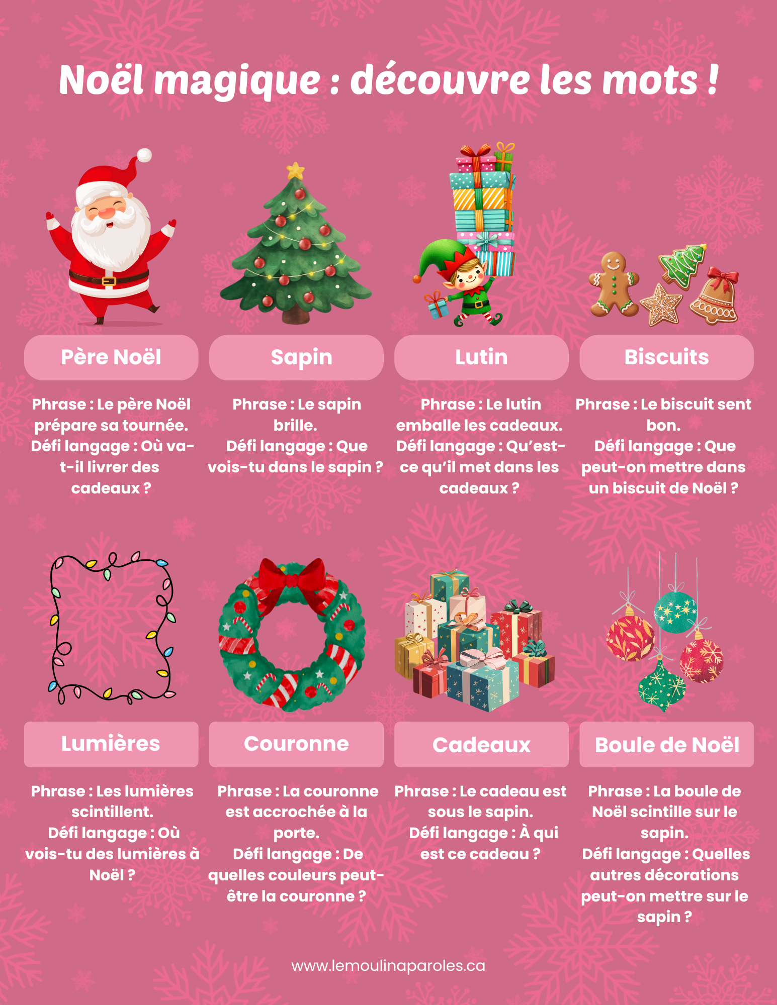 Ce produit numérique est idéal pour les orthophonistes, éducateurs et parents, et peut être utilisé à la maison, en garderie ou en milieu scolaire. Ajoutez de la magie à vos activités de Noël tout en favorisant le développement du langage !