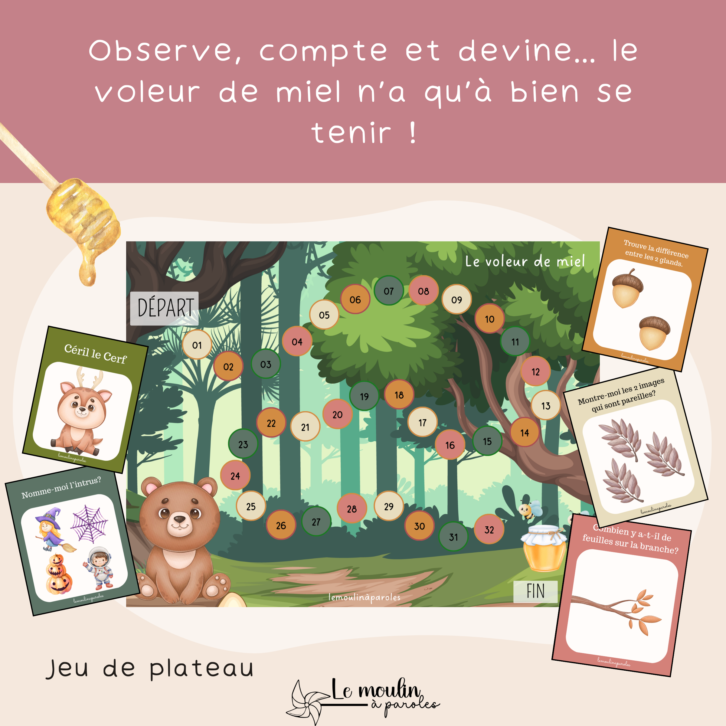 Retrouve le voleur de miel dans ce jeu pédagogique numérique interactif ! Les enfants développent leur observation, langage oral et habiletés sociales tout en trouvant les intrus et en dénombrant les trésors de la forêt.