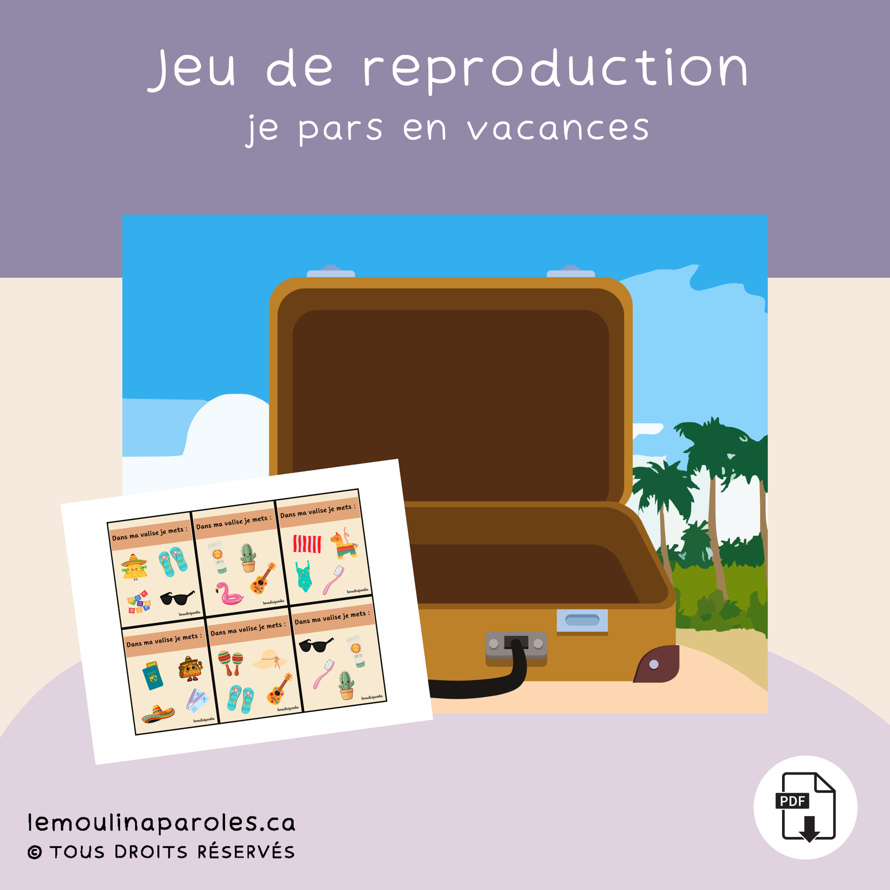 Chaque enfant pioche une carte de bord contenant des objets à emporter en voyage. Il nomme les objets, puis cherche ceux-ci pour les placer dans sa valise. Un jeu amusant pour enrichir le vocabulaire et travailler l’attention !