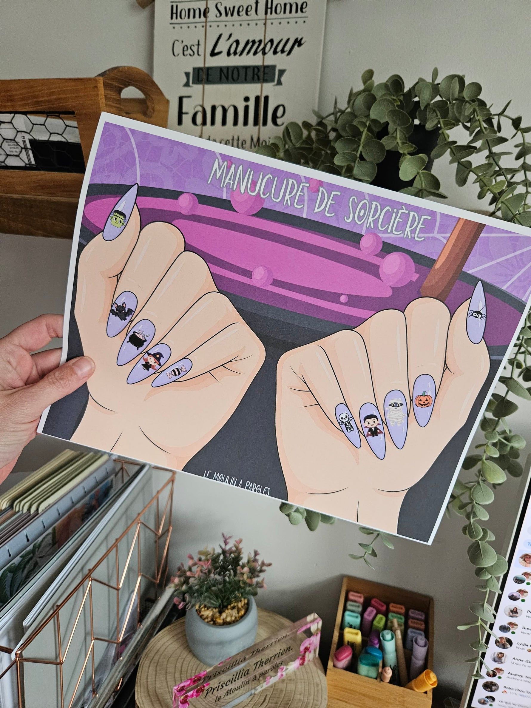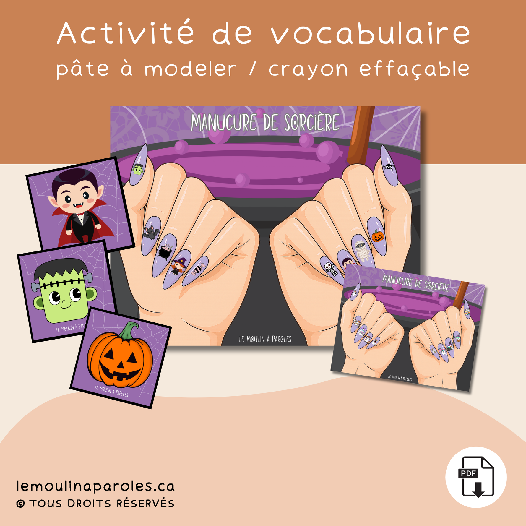 Les petits apprentis sorciers aident la sorcière à se préparer pour le bal… mais attention ! Ses ongles doivent être bien noirs pour cacher les images magiques qu’ils contiennent.