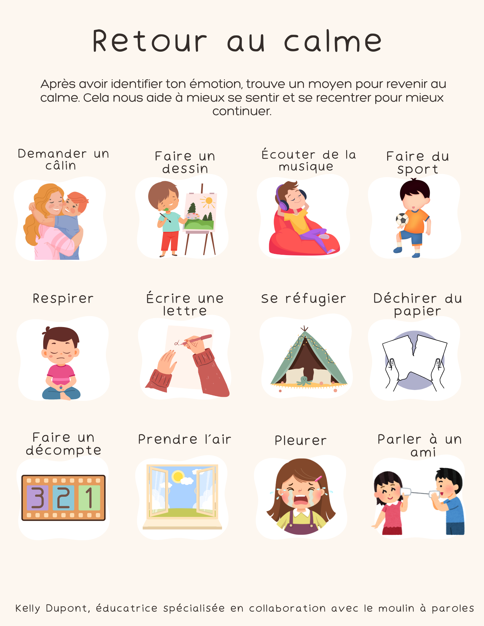 💛 Aide les enfants à retrouver leur calme après une émotion. Cette affiche ludique et chaleureuse propose des idées simples : dessiner, respirer, bouger, écrire ou demander un câlin.