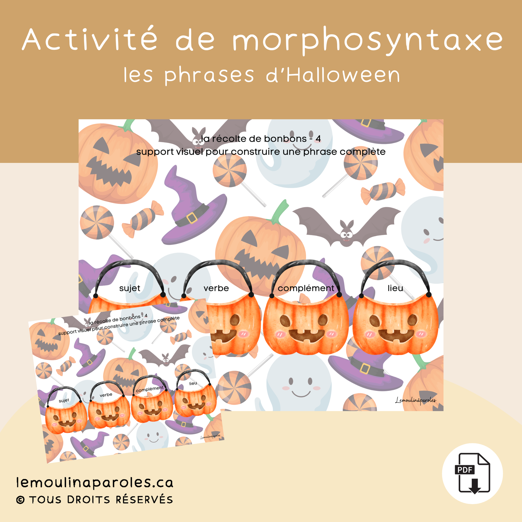 Production d'une phrase de type « sujet, verbe, complément, lieu ».