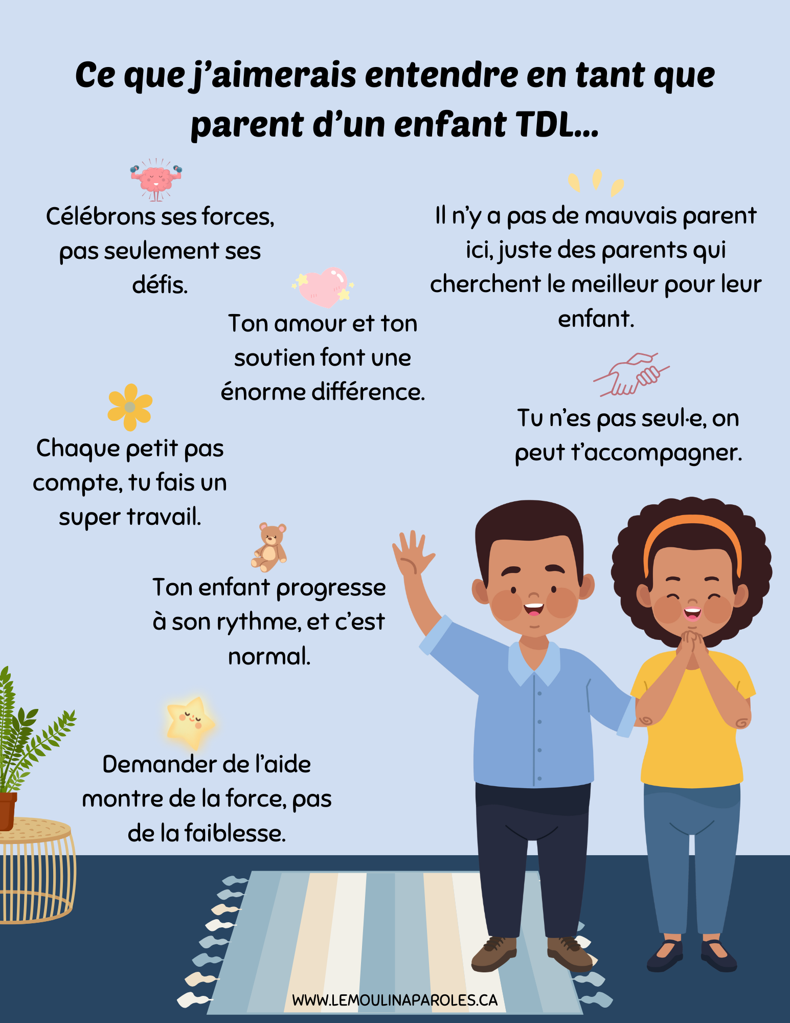 Offre un moment de réconfort à tous les parents d’enfants TDL avec cette affiche remplie de bienveillance et d’encouragements.